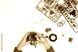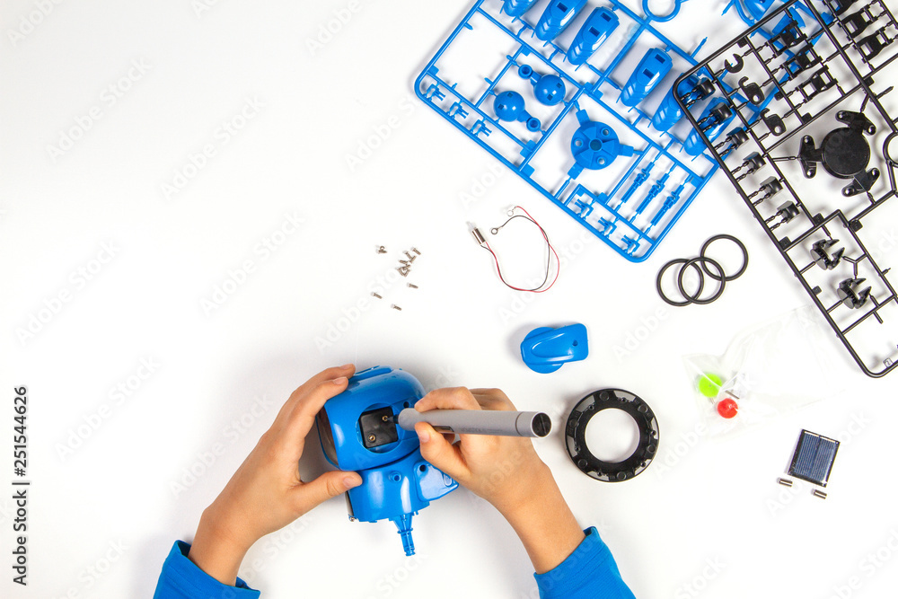 Child hands making blue robot. Robotic, learning, technology, stem education for children background
