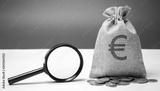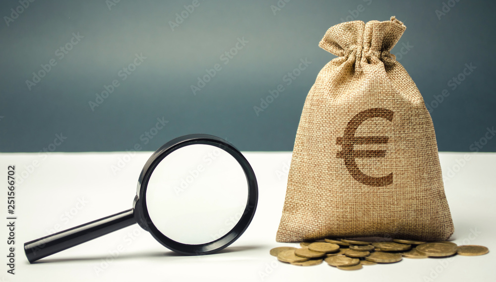 Money bag with euro sign and magnifying glass. The concept of finding sources of investment and sponsors. Charitable funds. Startups and crowdfunding. Search for available loans. Find a job.