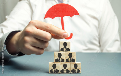 Boss holding a red umbrella and defending his team with a gesture of protection. Security and safety in a business team. Life insurance. Customer care, care for employees. Wooden blocks