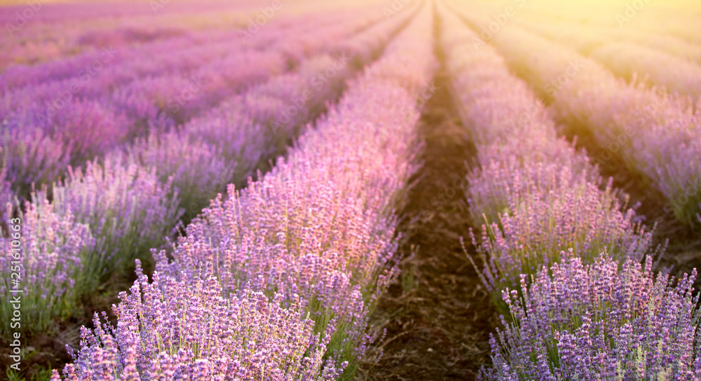 Sunset over a summer lavender field, looks like in Provence, France. The Lavender field. Beautiful image of lavender field over summer sunset landscape.