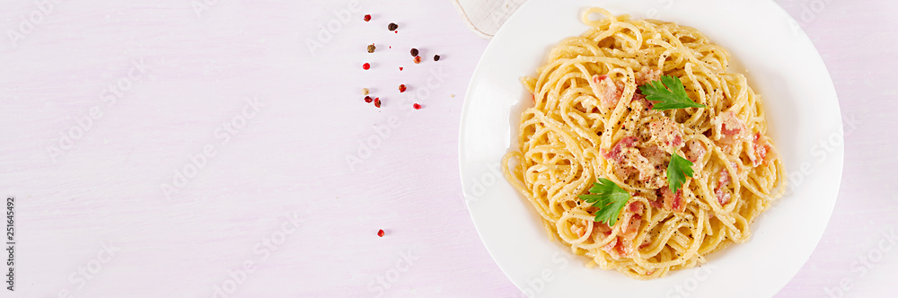 Classic homemade carbonara pasta with pancetta, egg, hard parmesan cheese and cream sauce. Italian cuisine. Spaghetti alla carbonara. Top view, banner, copy space
