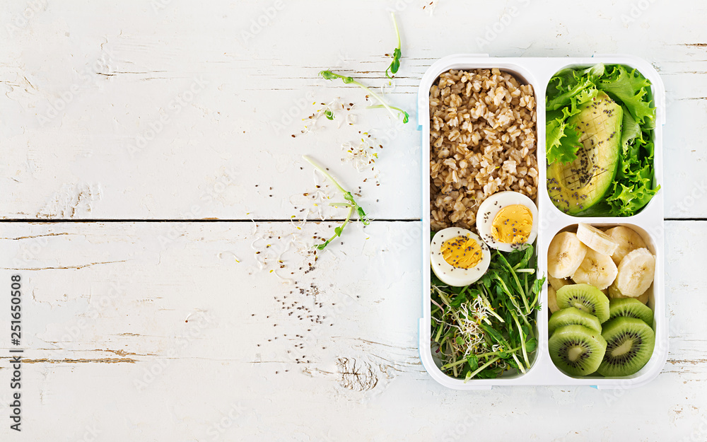 Lunch box with boiled eggs, oatmeal, avocado, micro greens and fruits. Healthy fitness food. Take away. Lunchbox. Top view