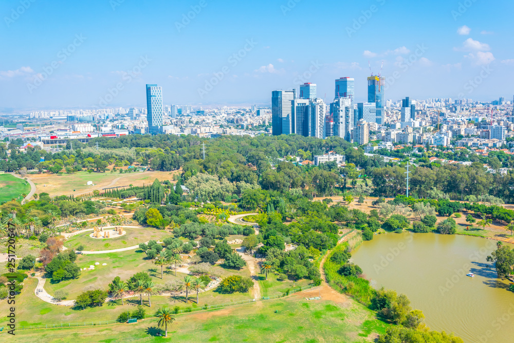 Cityscape of Tel Aviv viewed from TLV Balloon flying over Hayarkon park, Israel