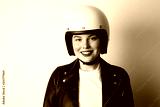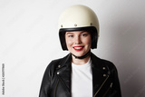 Handsome woman wearing black leather jacket and white moto helmet over background. Fashion, glamour and moto wear concept