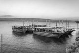 Sunset view of a wooden boat floating on the sea of galilee, Israel