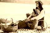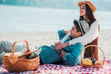 Picnic. Young couple having fun on the beach. Lifestyle, love, dating, vacation concept