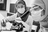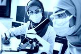 female muslim scientists using microscope and writing in clipboard during experiment in chemical laboratory