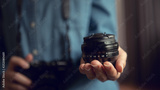 Photographer showing lens camera while hand using camera.