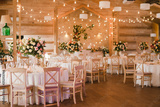 Coziness and style. Modern event design. Table setting at wedding reception. Floral compositions with beautiful flowers and greenery, candles, laying and plates on decorated table.