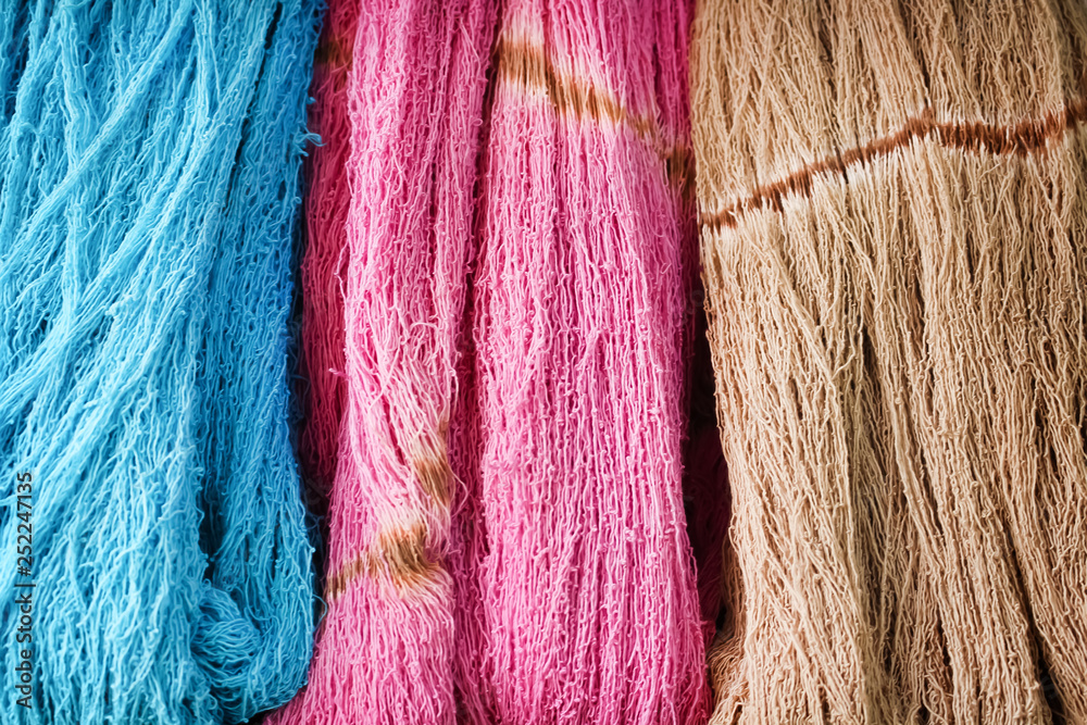Blue, pink and brown background, Patterns colorful nature of multicolored raw cotton thread texture group