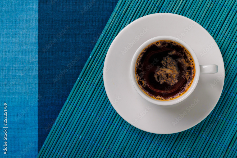 Top view of a black coffee cup on blue bamboo mat and fabric background