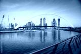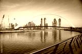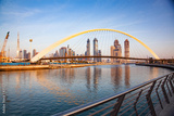 colorful sunset over Dubai Downtown skyscrapers and the newly built Tolerance bridge as viewed from the Dubai water canal