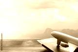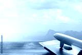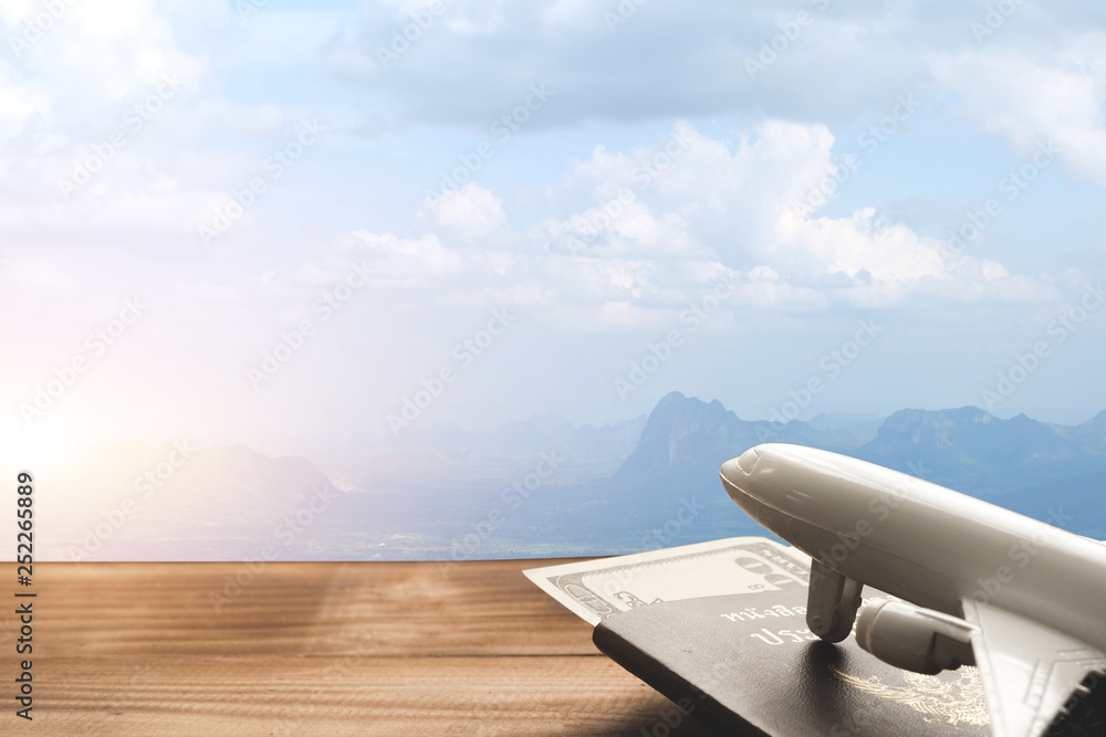 Mountain landscape with a view of the forest and white model of passenger plane on old wooden background. Travel saving and planning concept