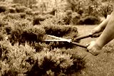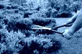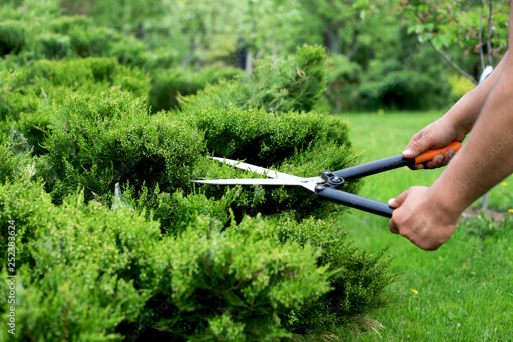 Cossack juniper ( lat. Juniperus sabina). Shearing of the juniper with gardening scissors, Soft focus. Garden art/ design/ landscape. Topiary. Blurred background with juniper.