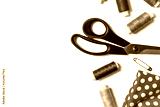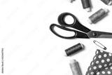 Colored thread coils, scissors, pin and fabric on white background, sewing, handmade and DIY concept - design for seamstress and tailor with copy space