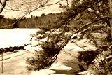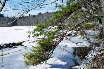 A tree hanging over a frozen landscape