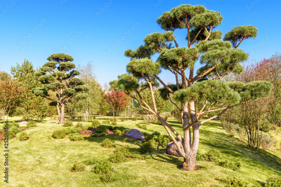 Park with gardens in modern town. Scenic conifer trees in natural public place. Green park with landscape design on sunny summer day. Panorama of landscaped area near residential houses.