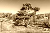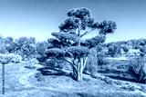 Park with gardens in modern town. Scenic conifer tree in natural public place. Green park with landscape design on sunny summer day. Panorama of landscaped area near residential houses.