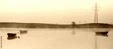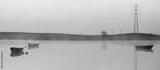 Pylon pollution in countryside landscape telephone cable line at sunset at boat lake