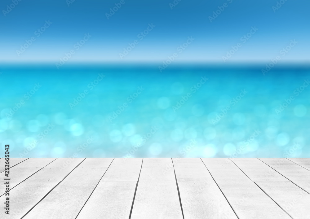 wooden table top with blur ocean background summer concept