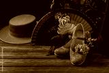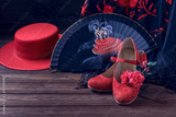 Beautiful and bright accessories for flamenco dance on a wooden background in a low key with free space. Shawl, hat, fan, shoes and a flower for the hair.