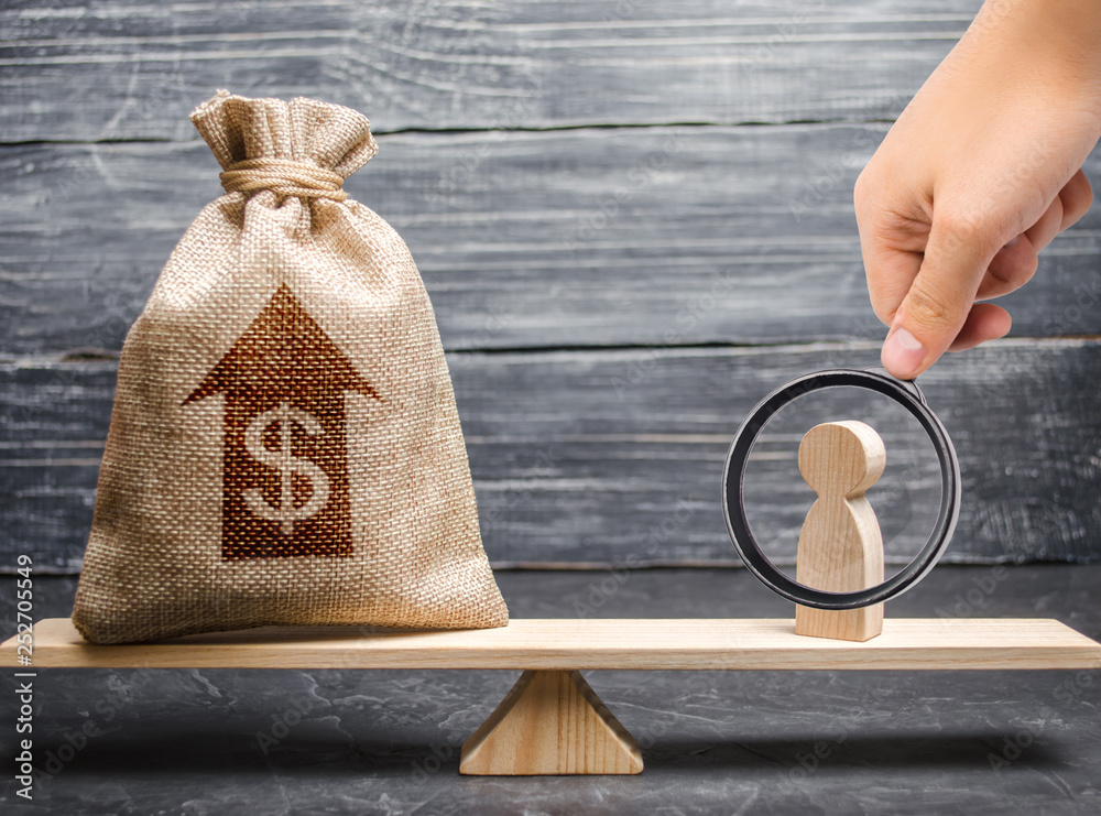 Magnifying glass is looking at a money bag with up arrow and man figurine on scales. Criteria and requirements for increasing the work of a specialist. The average salary in the labor market, pricing.