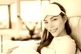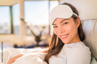 Happy Asian woman waking up early morning from beauty sleep wearing eye sleeping mask for a good night rest. Smiing young girl in bed.