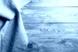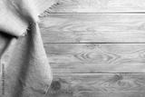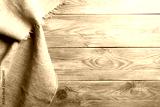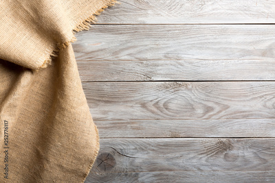 Burlap hessian sacking cloth on wooden table background with free space.