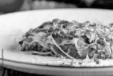 The concept of Italian cuisine. Lasagna with minced meat, bechamel sauce and parmesan cheese. Close up. Serving dishes in a restaurant in a white plate. copy space