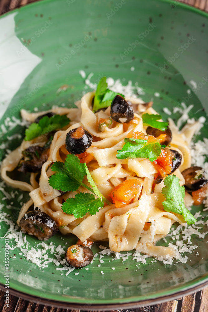 concept of Italian cuisine. Tagliatelle with vegetables, tomatoes, olives and parmesan cheese. Decorated with parsley. Serving dishes in a restaurant in a green plate. copy space