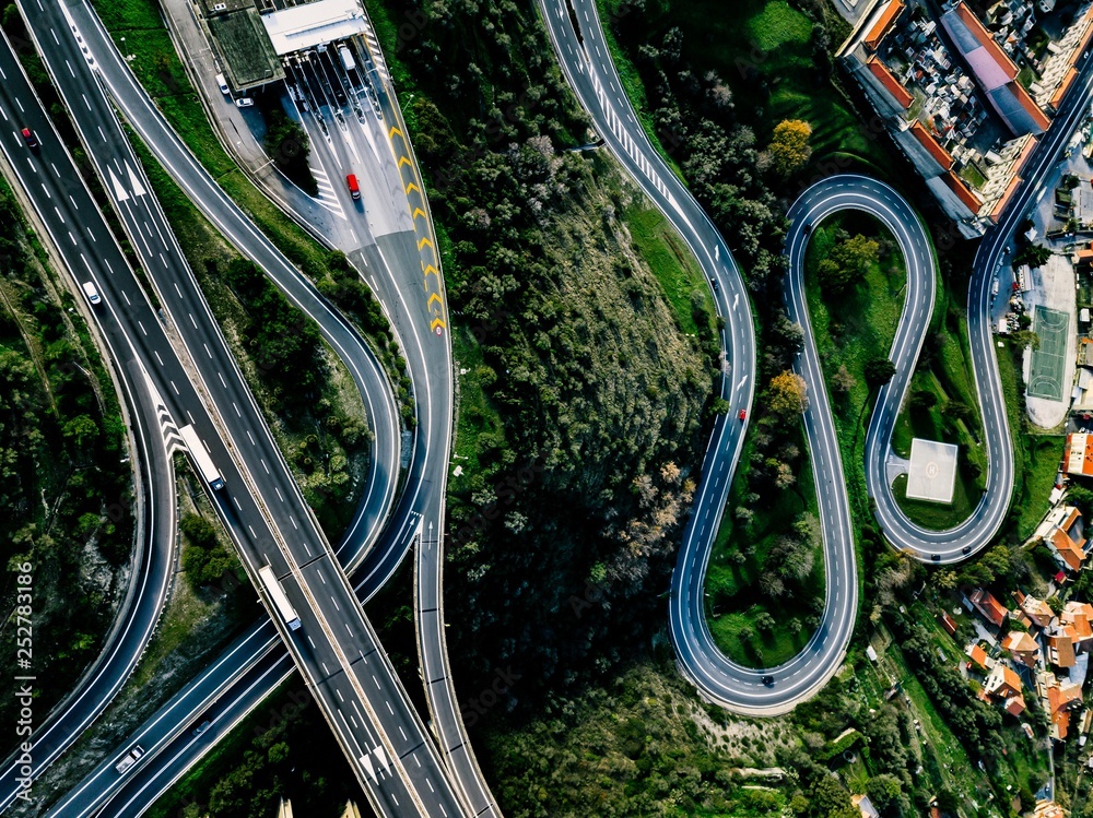 Aerial view of highway, expressway and motorway with a toll payment point in Italy