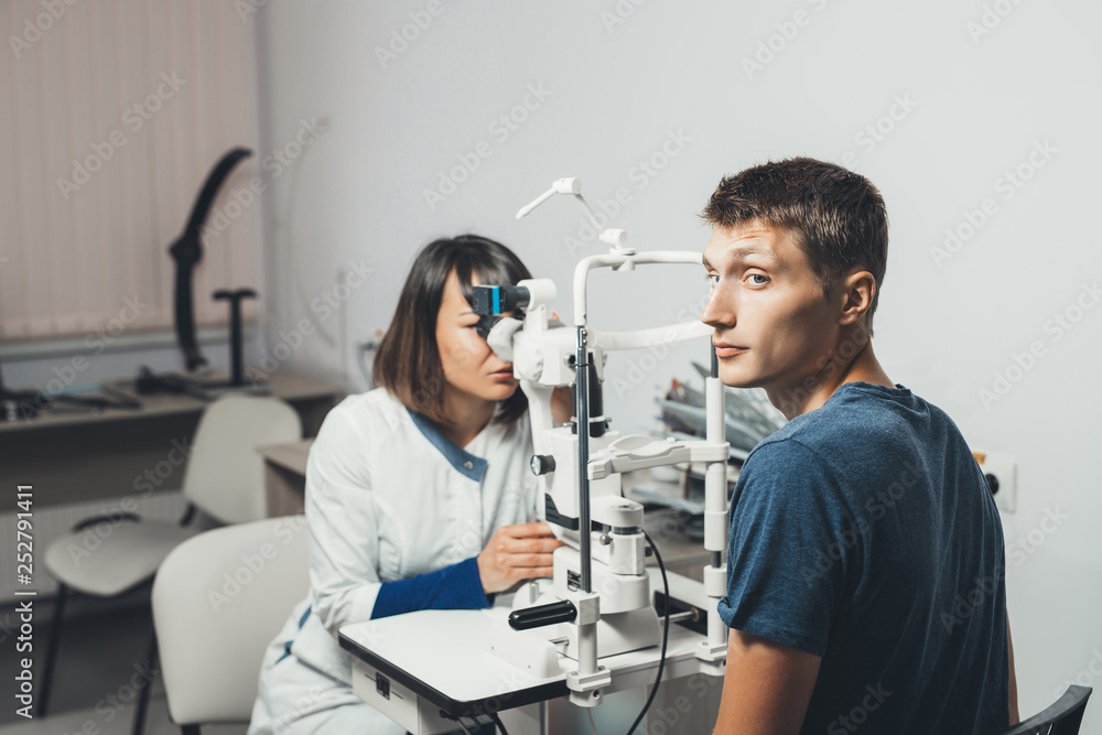 Doctor optometrist examines sight of guy. concept of visual impairment in adolescents.