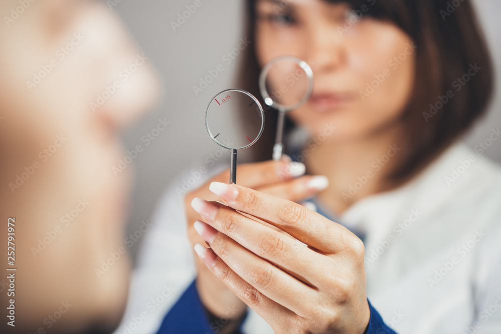 Lenses to check your vision. ophthalmologist diagnoses patient farsightedness. Focus on lenses