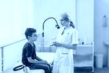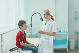 Woman ENT doctor examines boy's throat. Children's diseases, medical examination.
