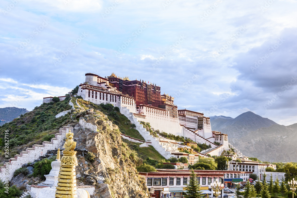 Sunrise scene of the Potala Palace from the former Lhasa West Gate in Lhasa, Tibet, China. It is now a museum and World Heritage Site.