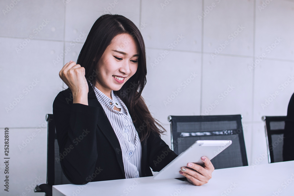 Happy and successful celebration woman, business girl looking on tablet and smile with profit and finance growing up