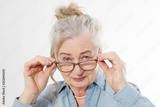 Surprised and shock Senior woman with wrinkle face and eye care glasses isolated on white background. Mature healthy lady. Copy space. Seniors lifestyle and old people happy concept.