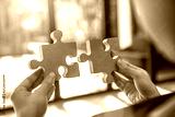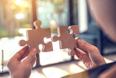 Closeup hand of woman connecting jigsaw puzzle with sunlight effect, Business solutions, success and strategy concept.