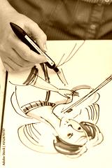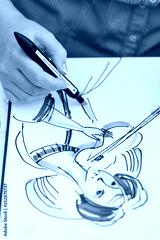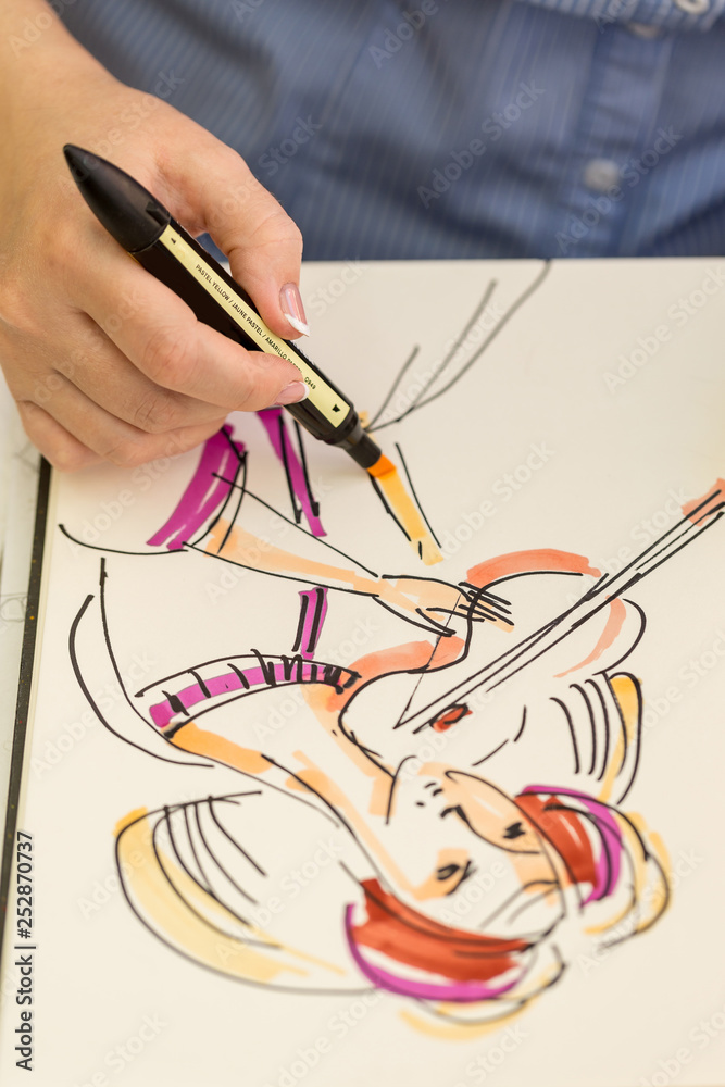 young artist makes a sketch with watercolor marker on paper