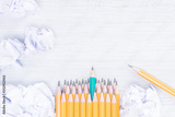 a stack of pencils lie on a white table next to white crumpled paper, a place for an inscription