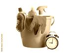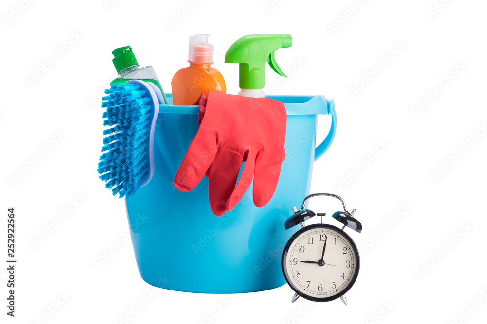 cleaning time concept: blue bucket with items for cleaning in the house and office isolated on white