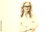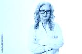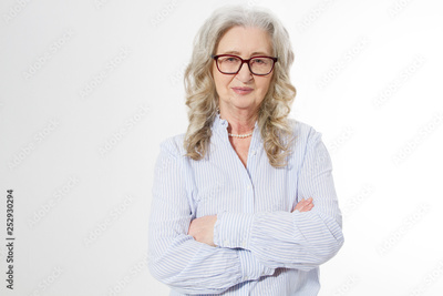 Senior business woman with stylish glasses and wrinkle face isolated on white background. Mature healthy lady. Copy space. Seniors lifestyle and old people happy concept.