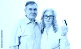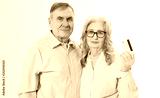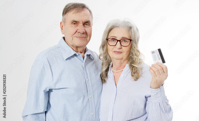 Happy senior family couple with credit card payment isolated on white background. Close up portrait woman and man with wrinkled face. Elderly grandparents people have fun. Smiling mature male, female.