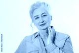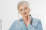 Closeup of smiling senior woman wrinkle face and gray hair. Old mature lady touching her wrinkled skin isolated on white background. Copy space