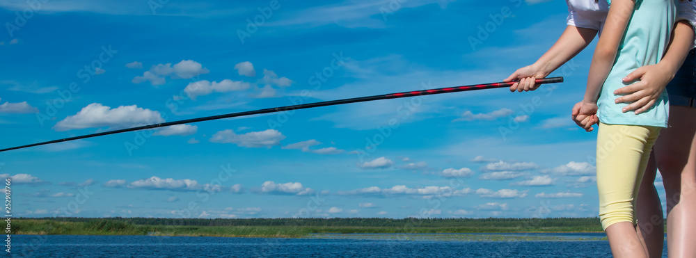 blue sky with clouds, panorama, mother and daughter holding a fishing rod, close-up, there is a place for the inscription