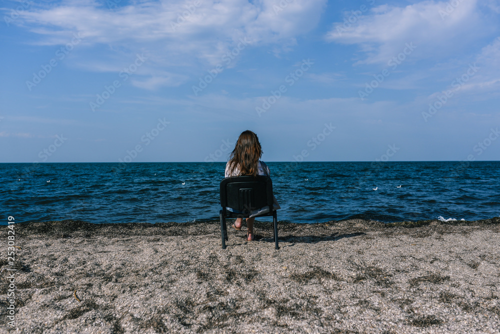 A lonely girl sits on a chair near the water. Seascape. Summer sunny day