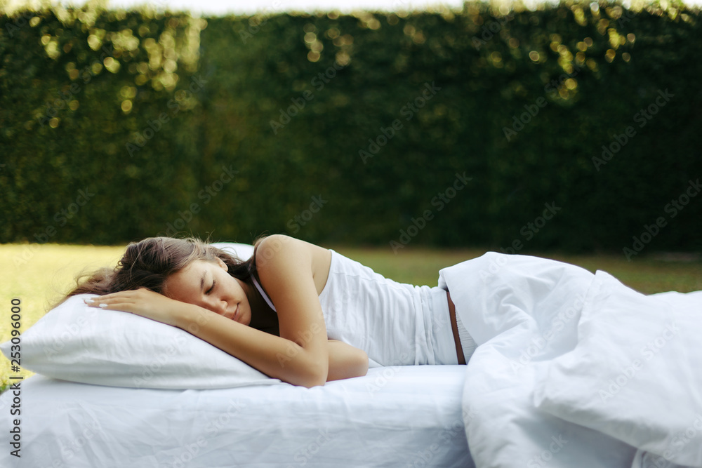 Girl sleeping on matress on grass