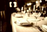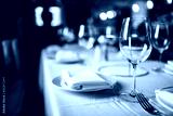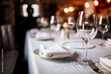 A close up shot of a restaurant table set up with tableware and wine glass. Concept of dining, hospitality and catering. Horizontal image with free space for text.