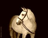 grey hunter horse on black background with reins