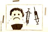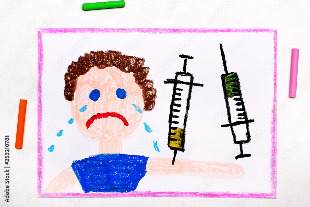 Colorful drawing: Child vaccination. Crying boy and syringe. Protective vaccination